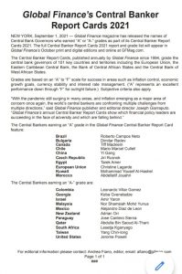 He added that the Global Finance’s annual Central Banker Report Cards show which financial policy leaders are succeeding in the face of adversity and which are falling behind.